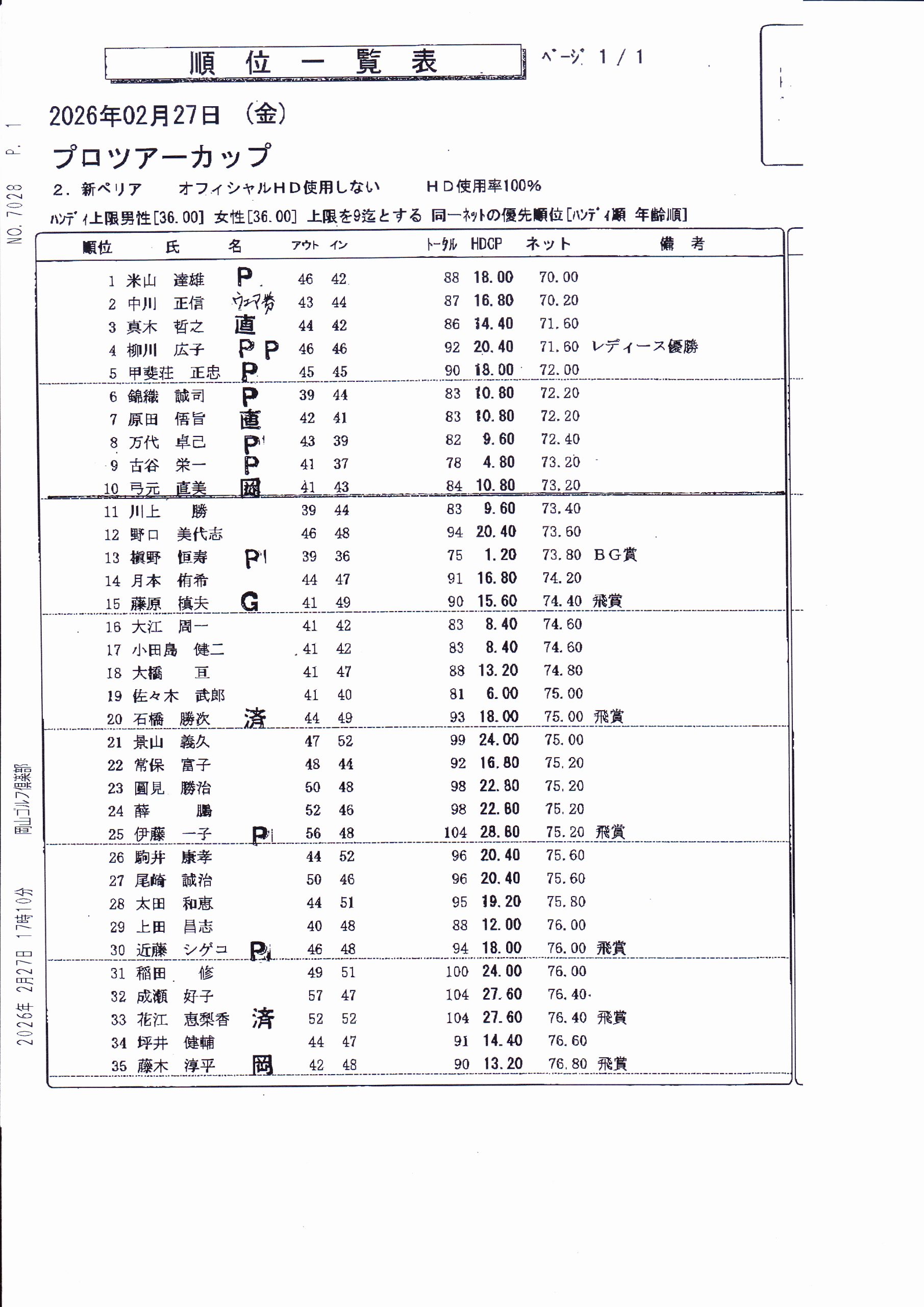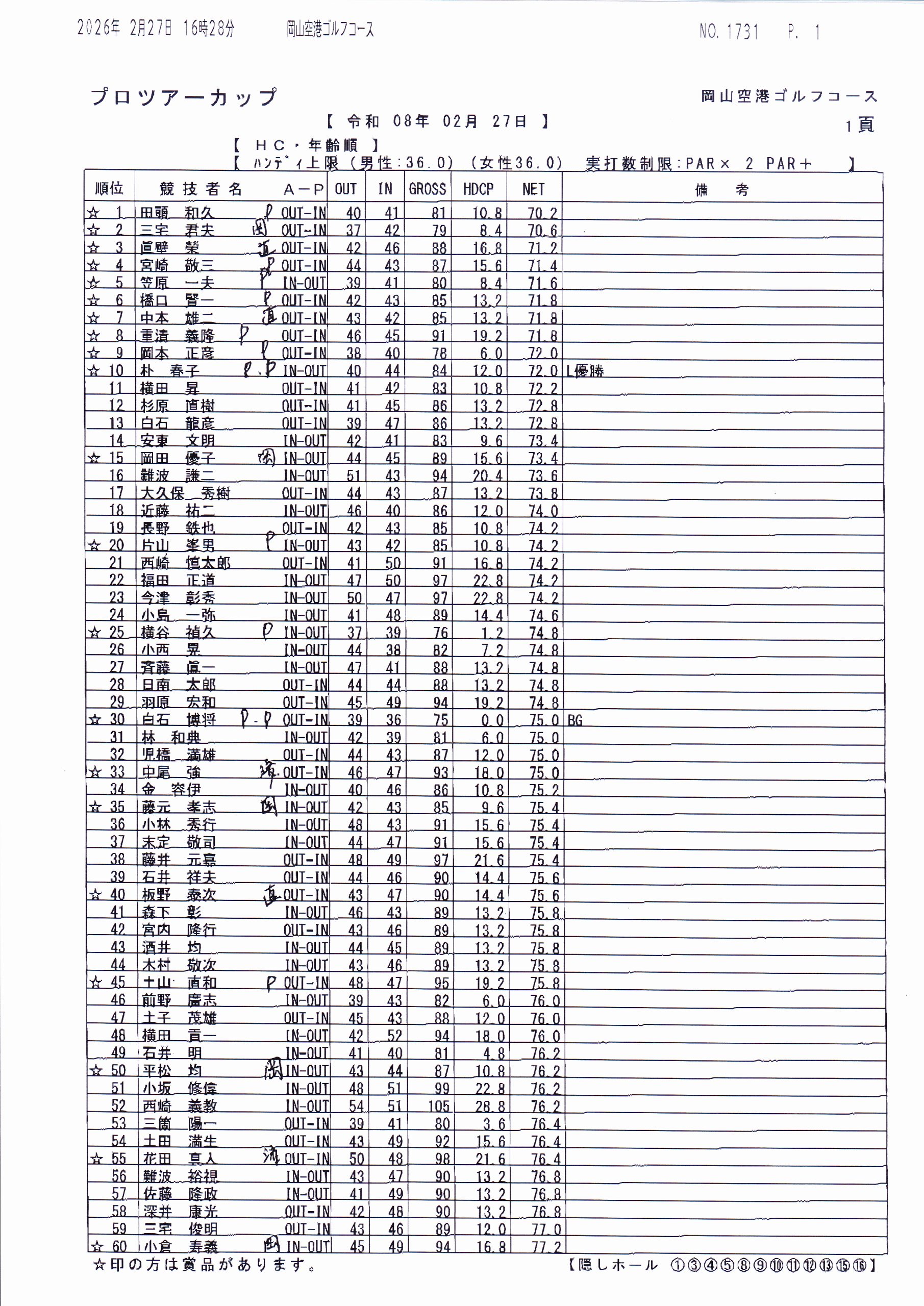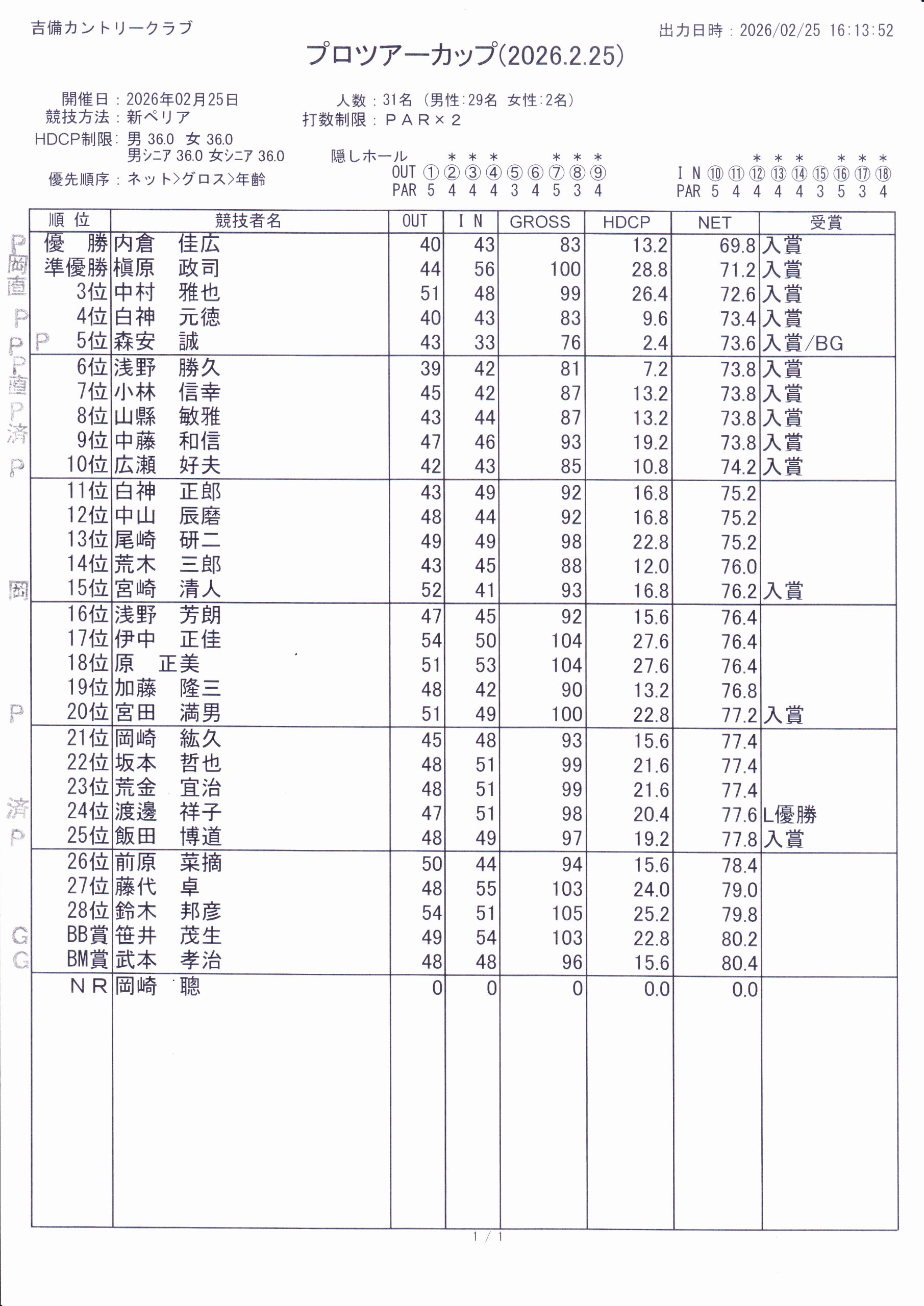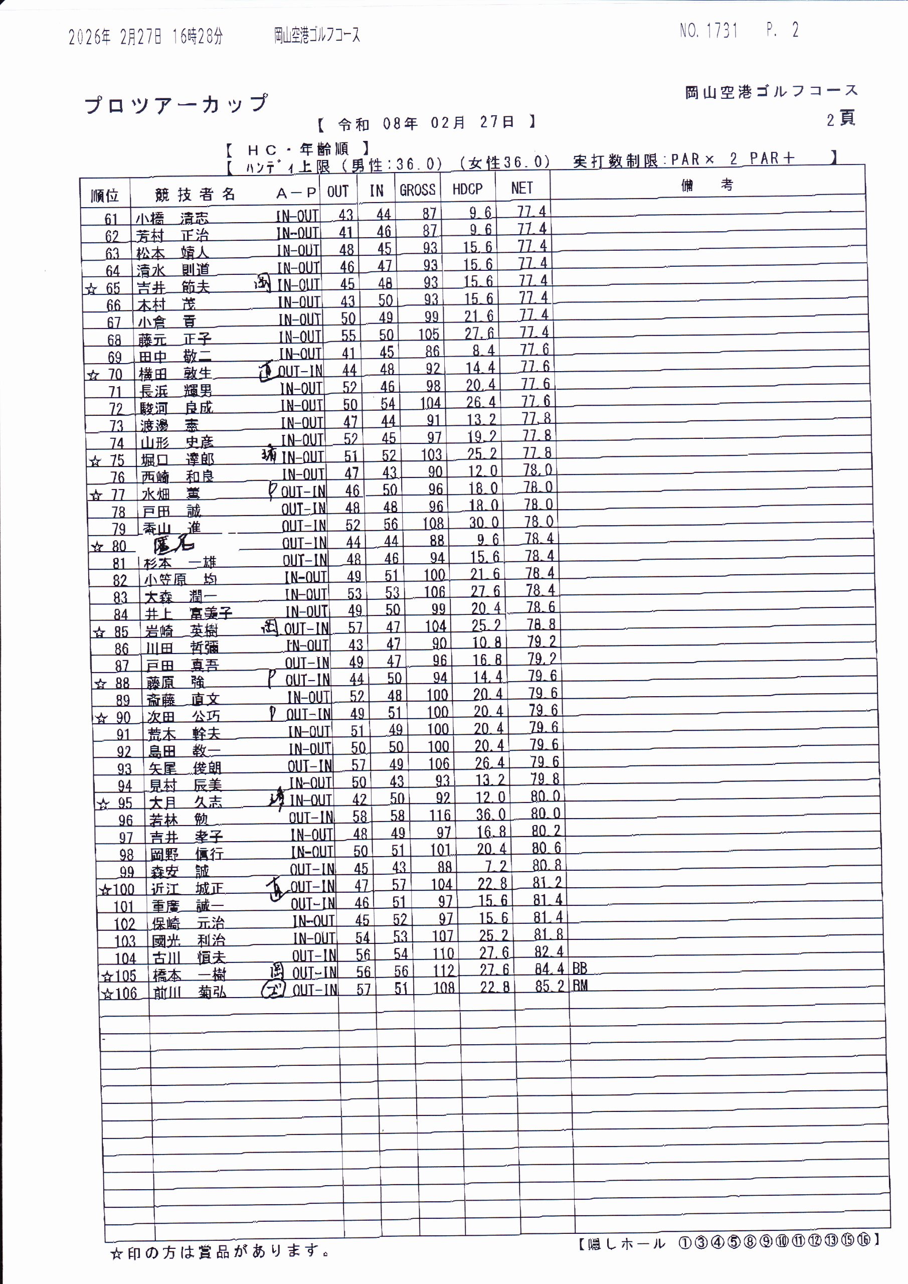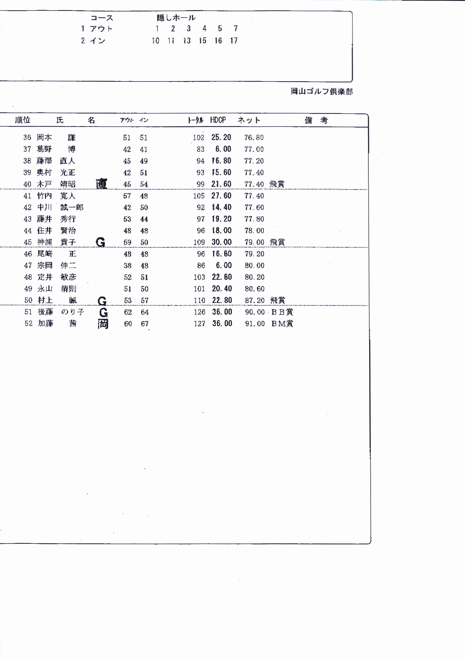 岡山CC(桃の郷)天候不良、及び参加者不足のため中止となります。